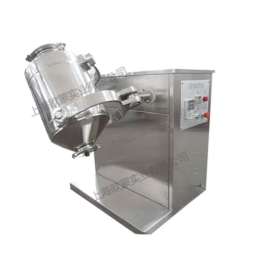 三維運動混合機/三維混合機裝料的筒體在主動軸的帶動下,作周而復始的平移、轉動和翻滾等復合運動,促使物料沿著簡體作三向復臺運動,從而實現多種物料的互相流動、擴散、積聚、摻雜.以達到均勻混合的目的。