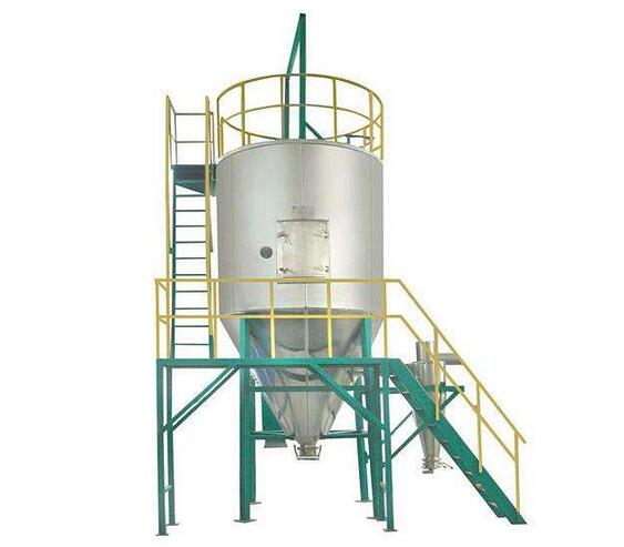 空氣經過過濾器和加熱器,進入干燥器頂部的空氣分配器,熱空氣呈螺旋狀平均進入干燥。料液由料液槽經過濾器由泵送至干燥器頂部的霧化器,使料液噴成極小的物狀液滴,料液和熱空氣并流接觸,水份疾速蒸發,在極短的時間內干燥為廢品。廢品同干燥塔底部和旋風別離器排出,廢氣由風機抽出排出。