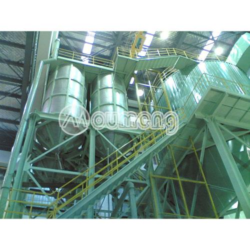 除塵系統(tǒng)由高效旋風(fēng)分離器、布袋除塵器、離心風(fēng)機(jī)等組成。抽風(fēng)機(jī)將較細(xì)的顆粒料與干燥空氣一起送入高效旋風(fēng)分離器。經(jīng)過(guò)有效分離,較細(xì)顆粒料進(jìn)入分離器底部的收集筒回收,所剩的含有極少量微細(xì)顆粒料的廢氣由離心風(fēng)機(jī)吸入布袋除塵器經(jīng)過(guò)再次除塵收集,實(shí)現(xiàn)了廢氣的無(wú)害化處理,最后的廢氣從煙囪排出。