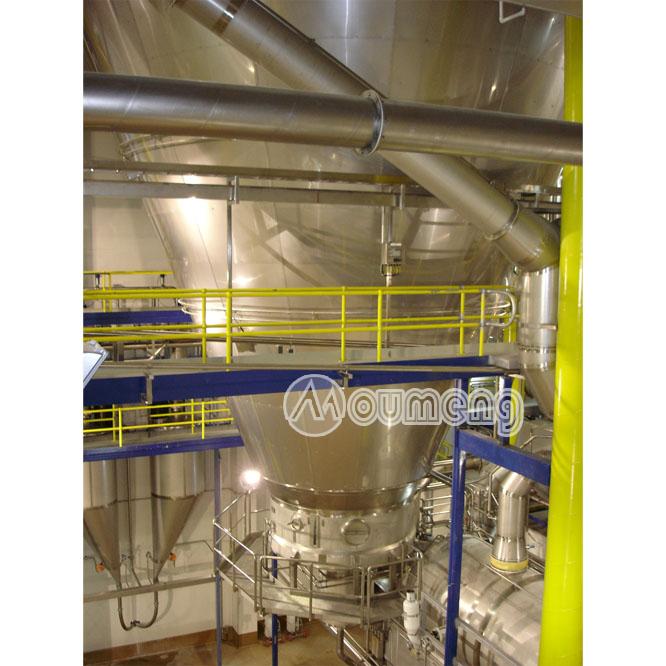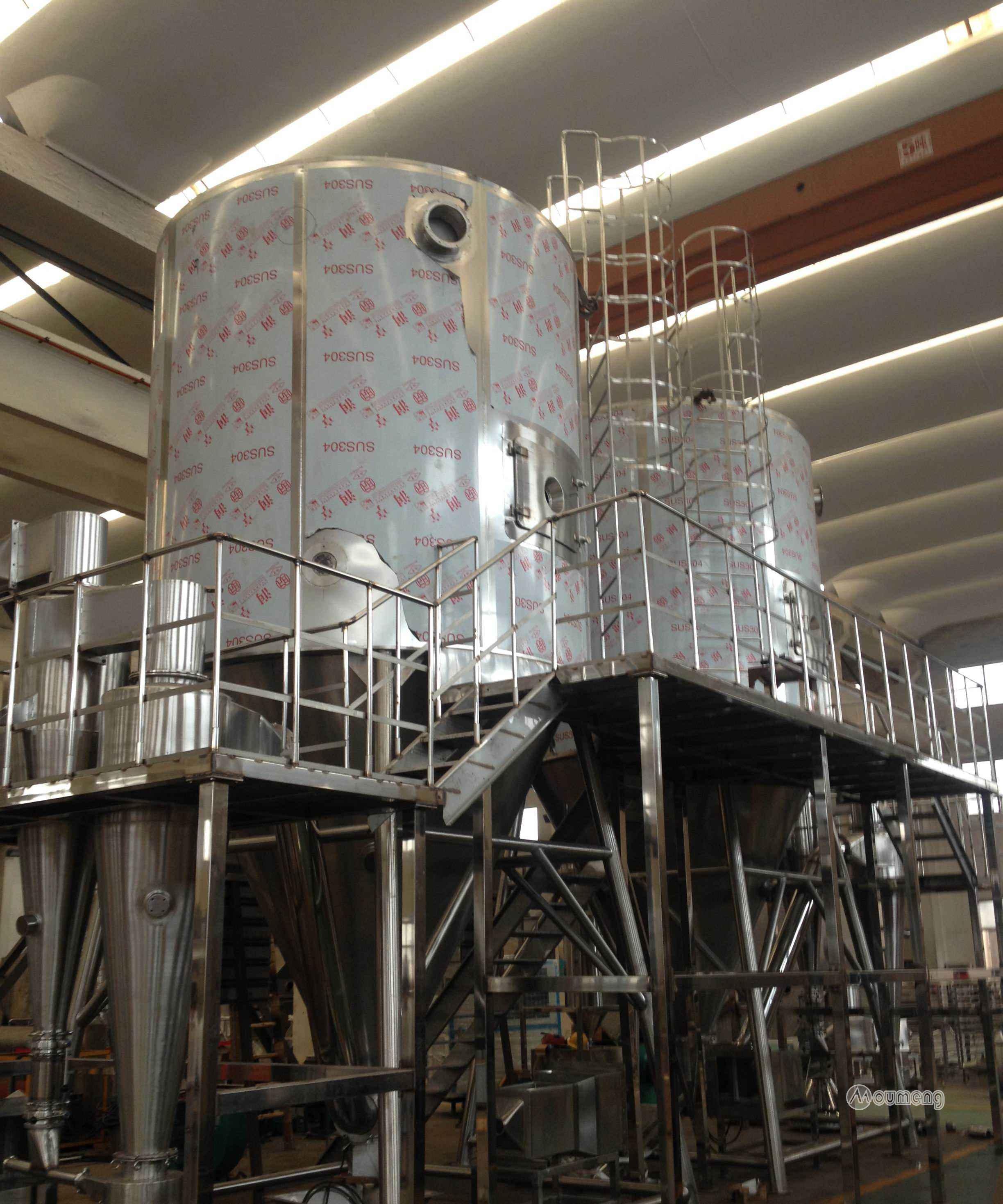 工作原理空氣經(jīng)過濾和加熱,進(jìn)入干燥器頂部空氣分配器,熱空氣呈螺旋狀均勻地進(jìn)入干燥室。料液經(jīng)塔體頂部的高速離心霧化器,(旋轉(zhuǎn))噴霧成極細(xì)微的霧狀液珠,與熱空氣并流接觸在極短的時(shí)間內(nèi)可干燥為成品。成品連續(xù)地由干燥塔底部和旋風(fēng)分離器中輸出,廢氣由風(fēng)機(jī)空。